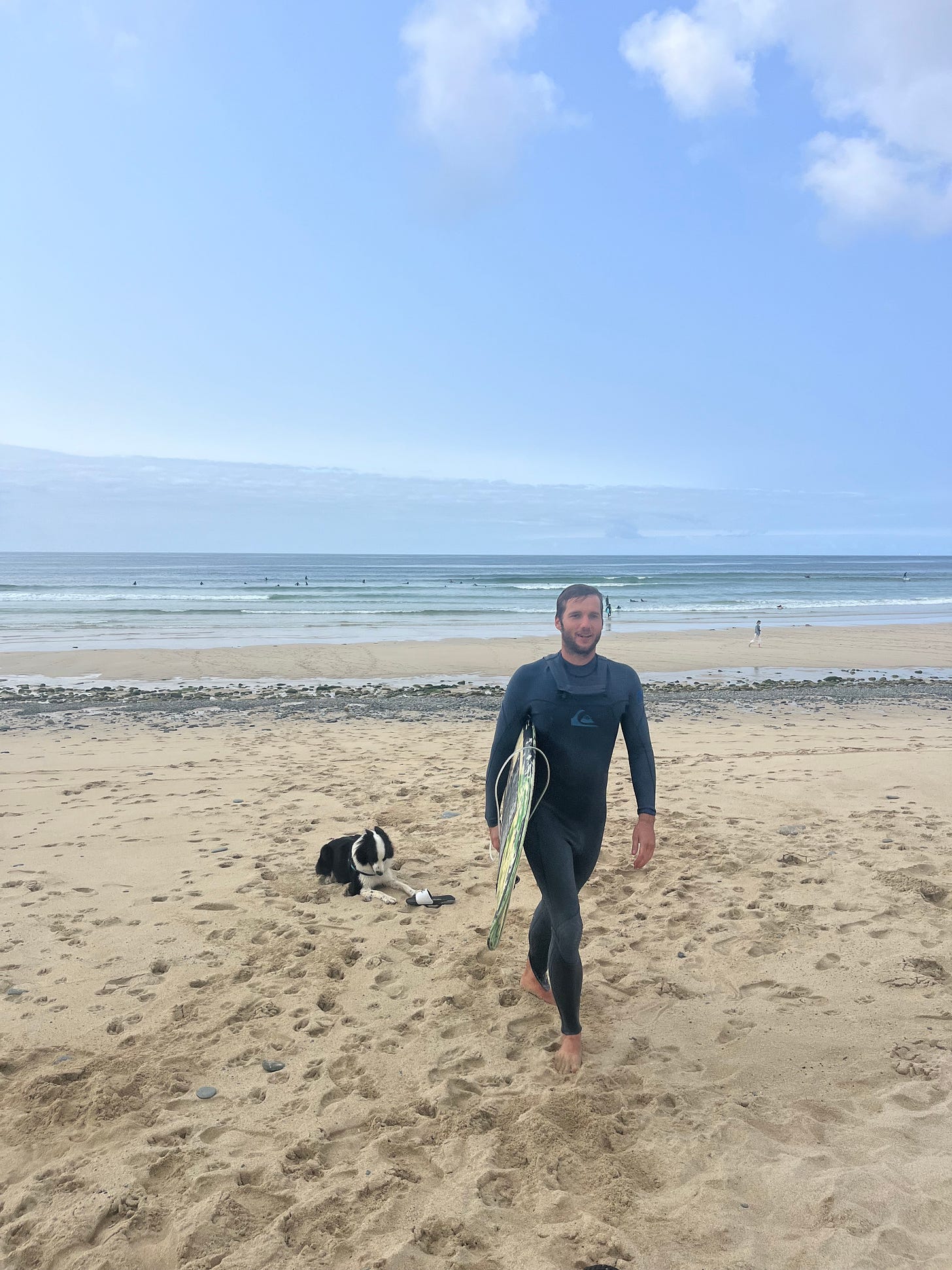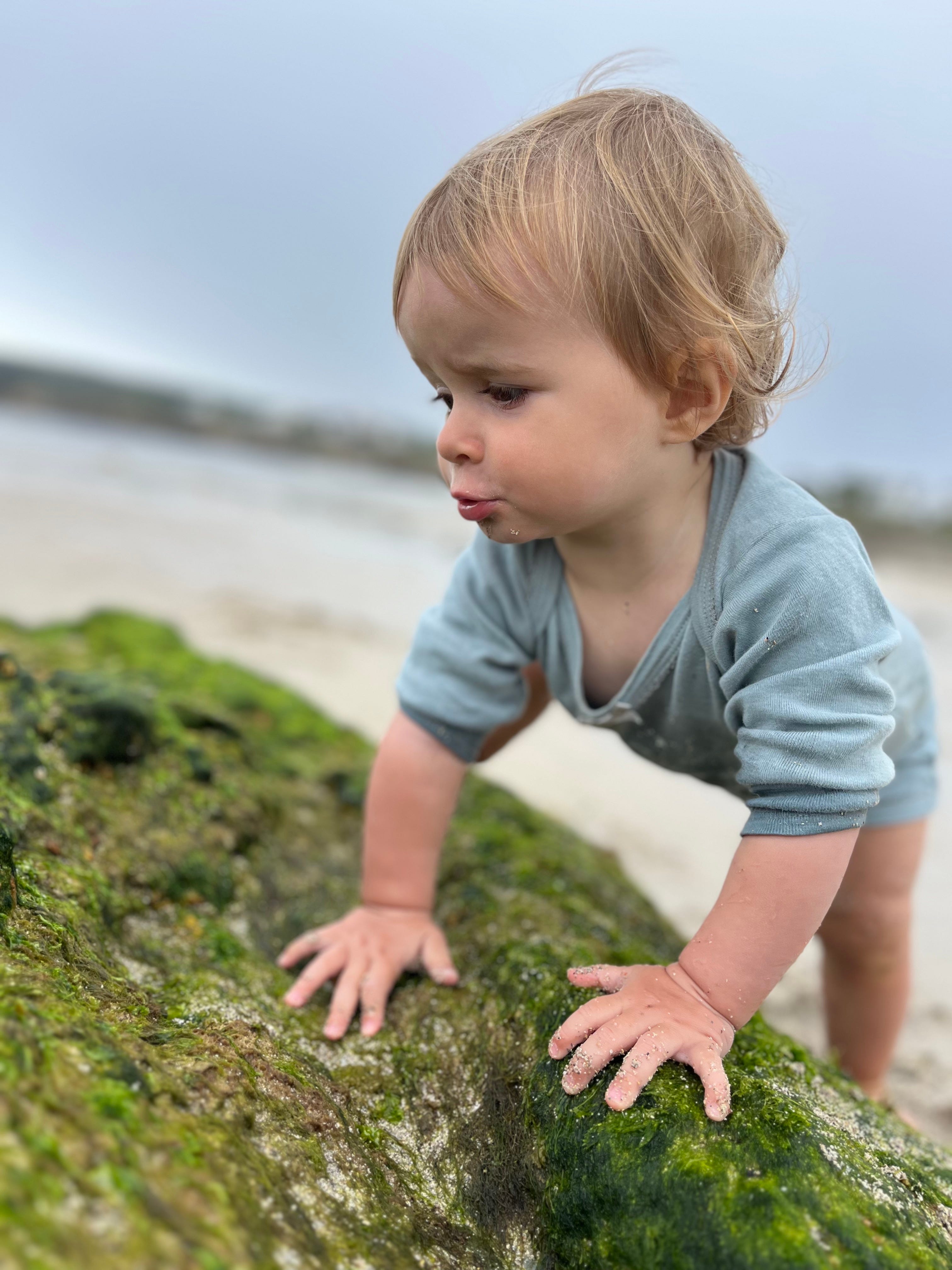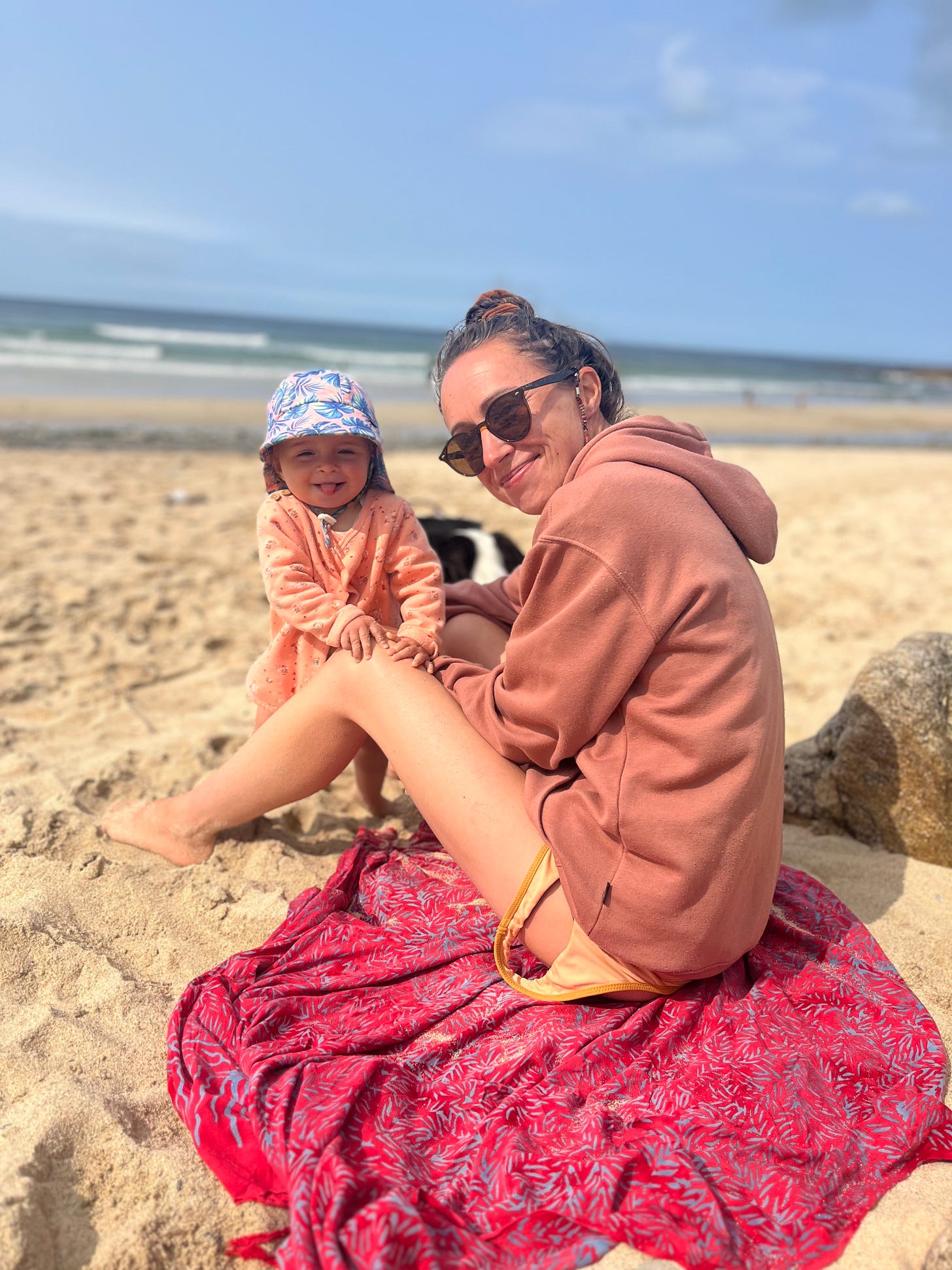 It’s strange to be pulling on a full 3mm wetsuit just a week after escaping the relentless heatwaves of the southwest, yet here I am, feeling a little chilly despite the sun poking through patches of smoky grey clouds. Sahara, with a full belly of breast milk, is crawling around Remy’s legs in the soft white sand, eyeing a cluster of smooth rocks to climb. Hunter, impatient with his newfound passion, has already run off ahead, while Ryder waits for my return—we’re sharing a board. I trot off to the shoreline; it’s low tide, and I carefully cross palm-sized pebbles to place my Christian Bradley fish-tailed surfboard, set up as a thruster (three-fins), and give my body a gentle stretch. It’s only my second attempt at surfing postpartum, and last time I couldn’t even stand up.