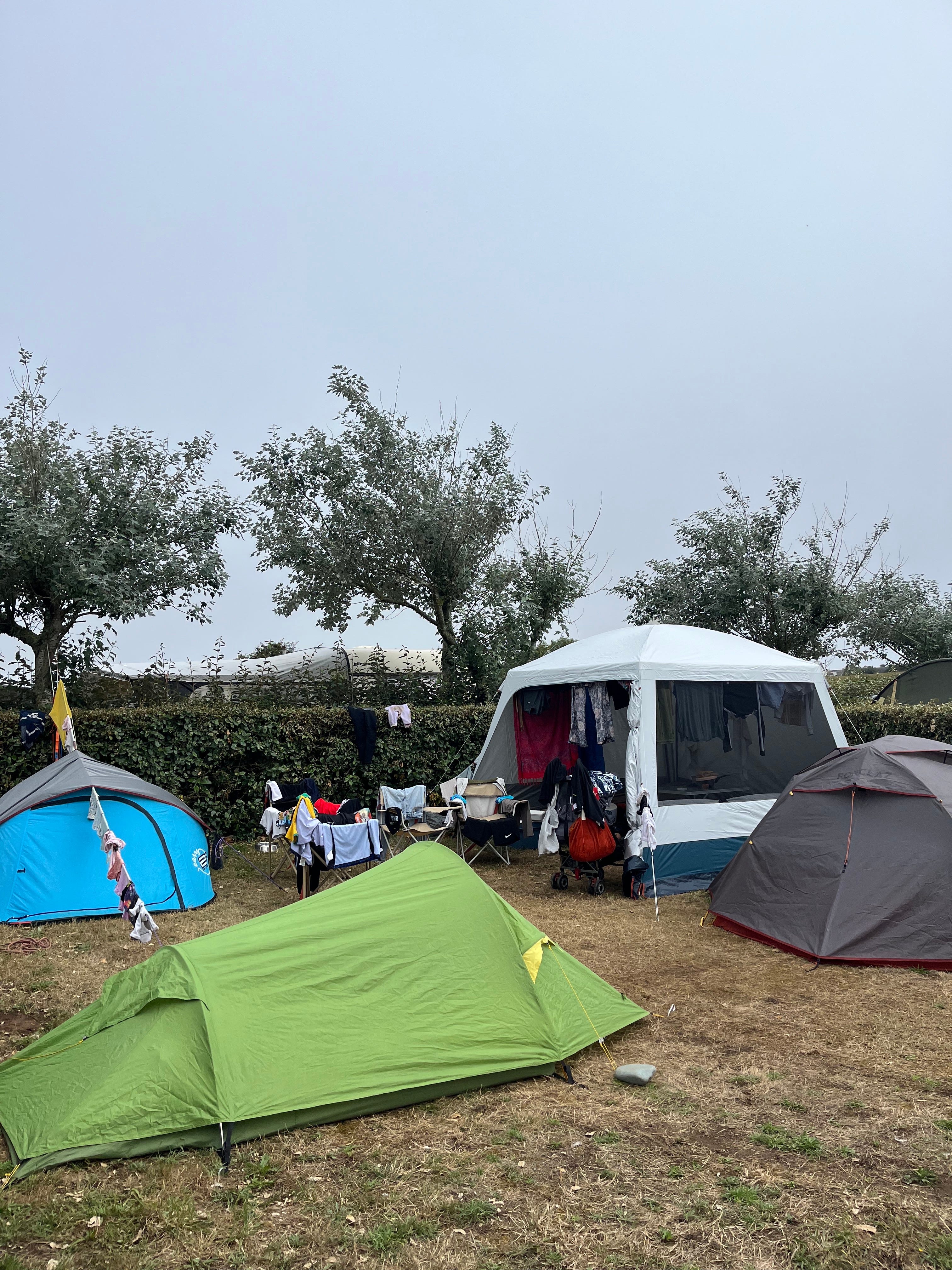 We’ve camped before, on the east coast of Australia, when I was between travels with the kids—it’s how Remy and I first met and began living together in my cozy tent. Our setup here, though, is somewhat overly basic, and the famed Breton drizzle and fog caught us by surprise—it’s summer, after all—and forced an out-of-budget upgrade when two out of three tents began leaking. Now, with a new communal shelter tent, our BBQ gassed up, and a deep freezer available in the common room to re-freeze our Esky’s cold bricks each day, we’re a little more comfortable.